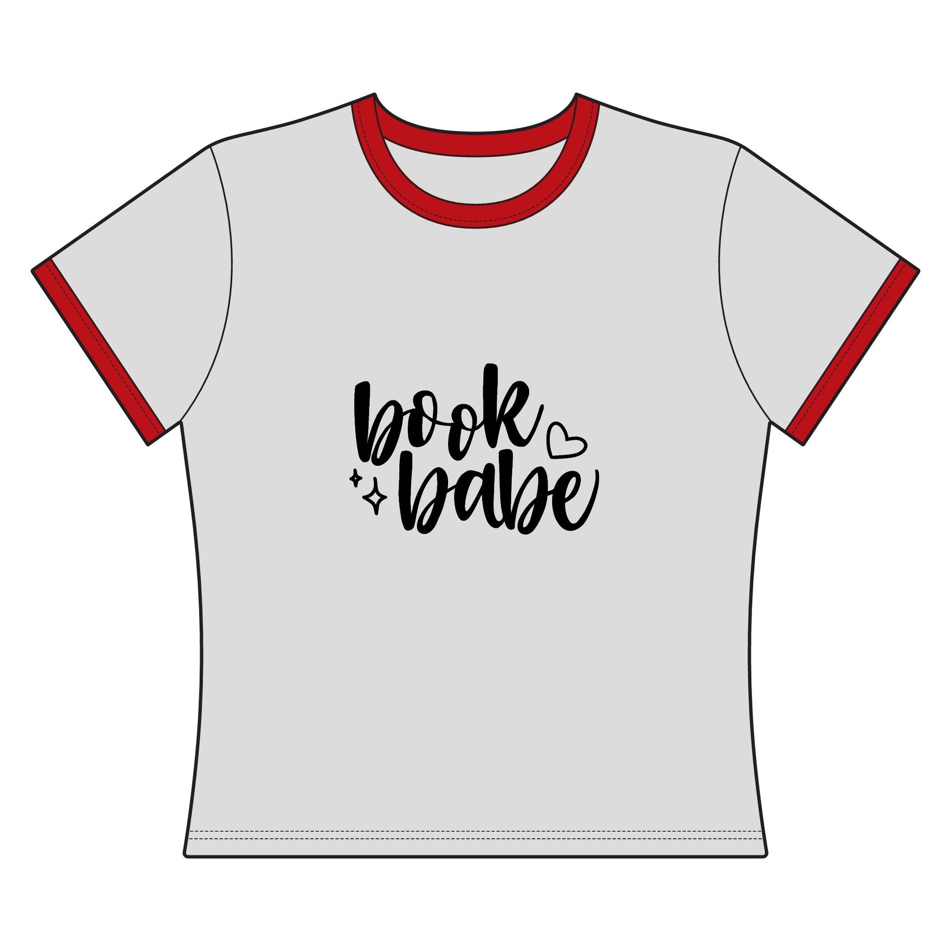 This cropped ringer tee brings back retro vibes with a soft, body-hugging silhouette and bold contrast trim. The hand-lettered “book babe” front art adds a warm, whimsical touch. Wear it to slow mornings with coffee and paperbacks, to bookstore dates, or layered under denim for literary meetups.